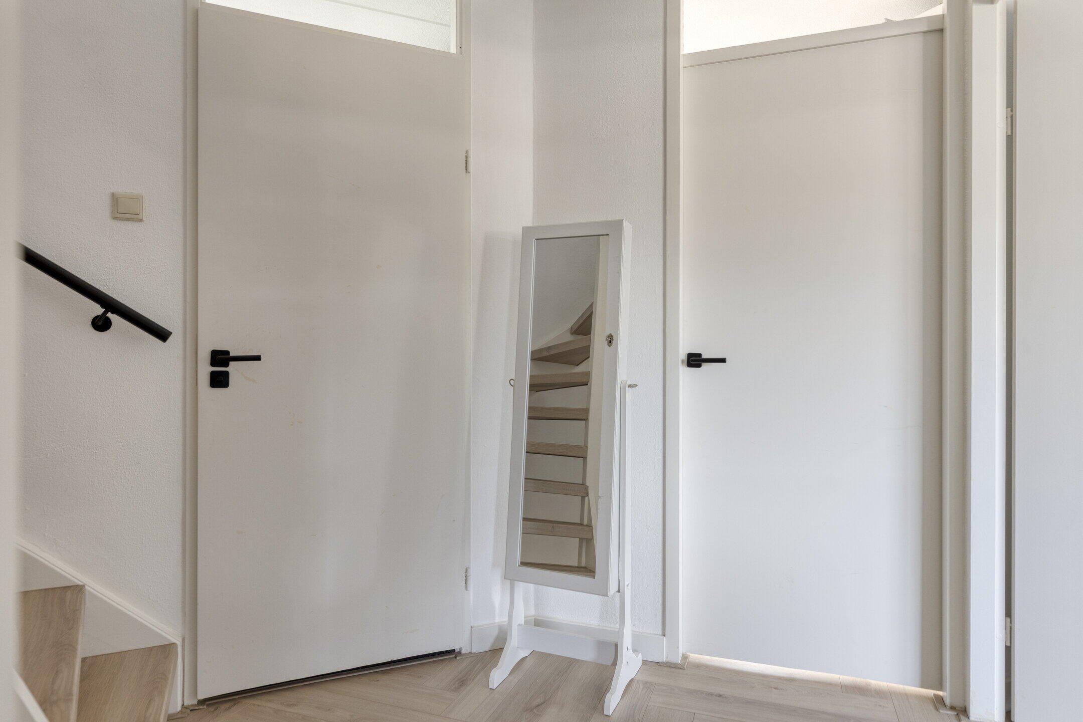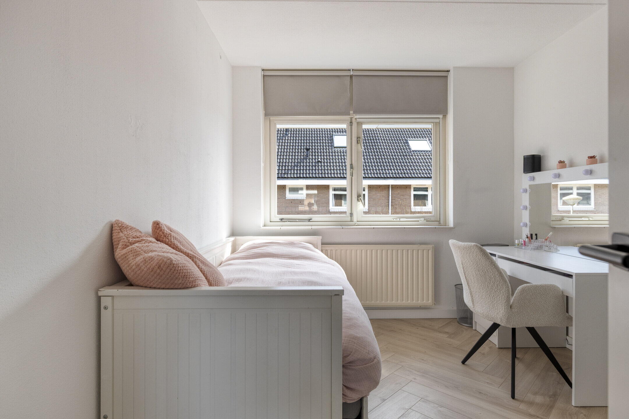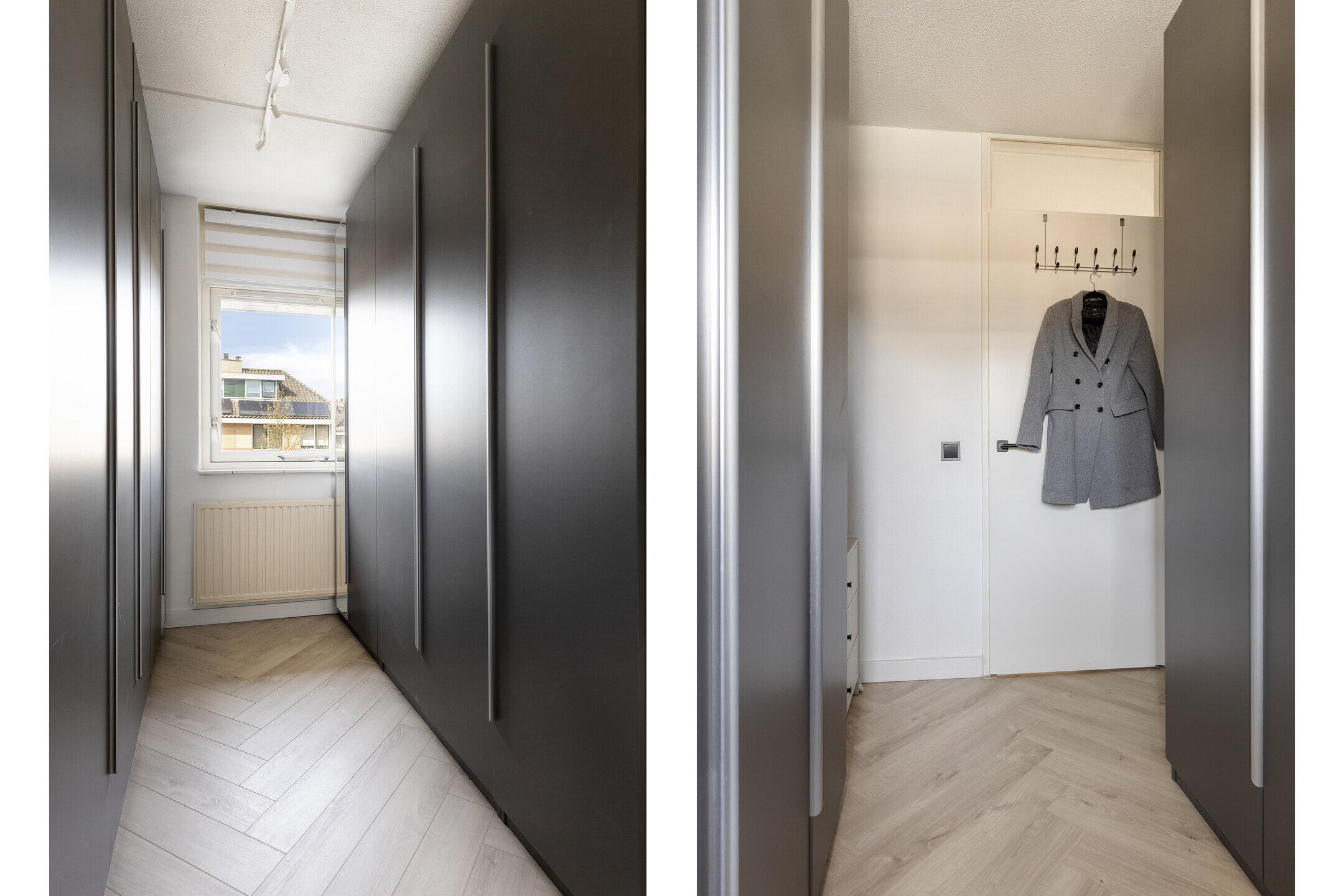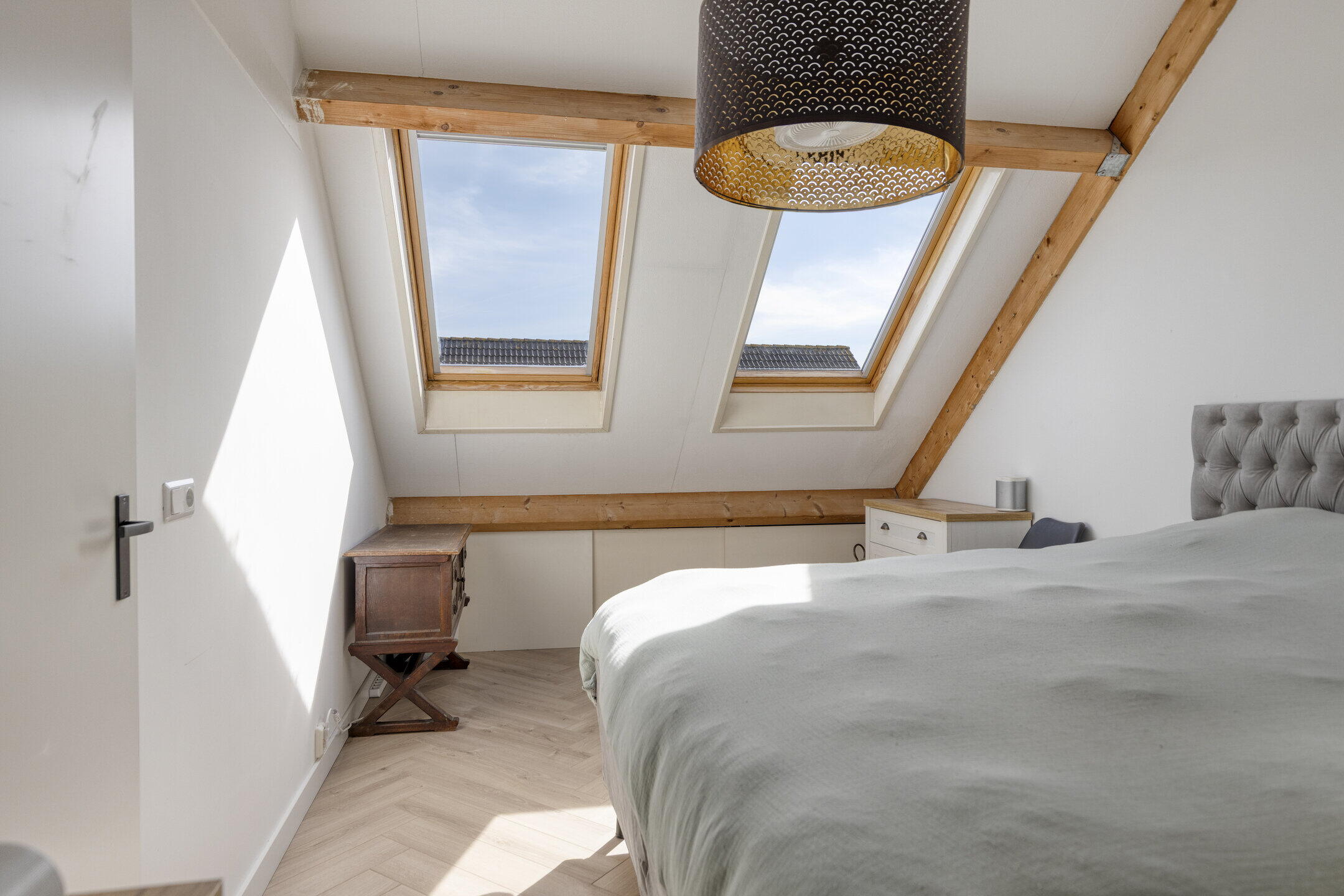 Op de eerste verdieping ervaar je direct de eenheid van de woning dankzij de drempelloos doorgelegde visgraat laminaatvloer. Momenteel beschikt deze woonlaag over twee royale slaapkamers en een luxe walk-in closet. Heeft u een extra kamer nodig? De inloopkast is met een eenvoudige ingreep weer terug te brengen naar een volwaardige derde slaapkamer.