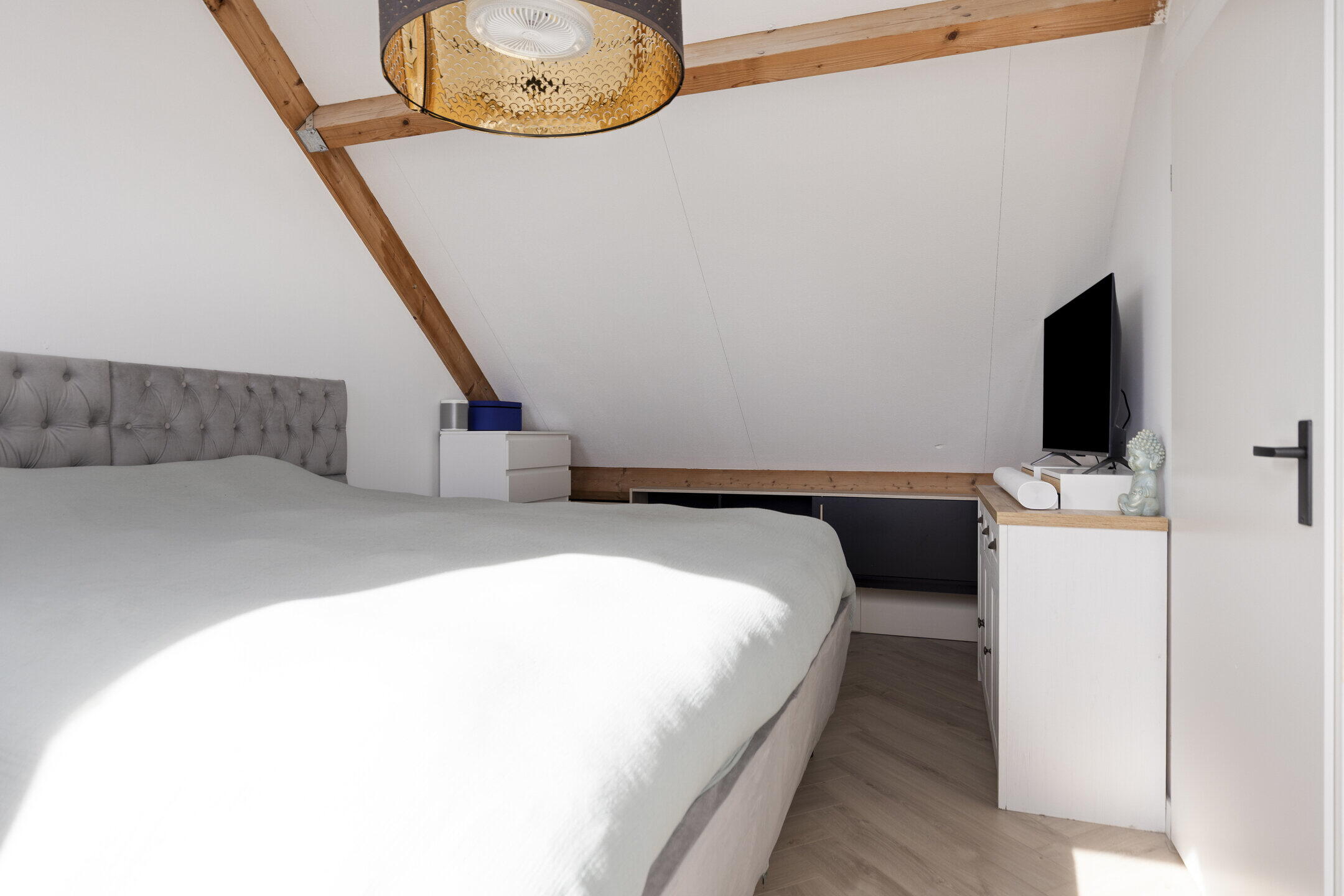 De tweede verdieping beschikt over een ruime overloop met aansluitingen voor wasmachine en droger, evenals een opstelplaats voor de c.v.-ketel ('19) . Hier is ook een ruime slaapkamer te vinden die kan dienen als een rustige werkplek of speelruimte voor de kinderen. Achter de knieschotten is er voldoende bergruimte, wat prettig is voor het opbergen van gelegenheidsartikelen en seizoensgebonden spullen.