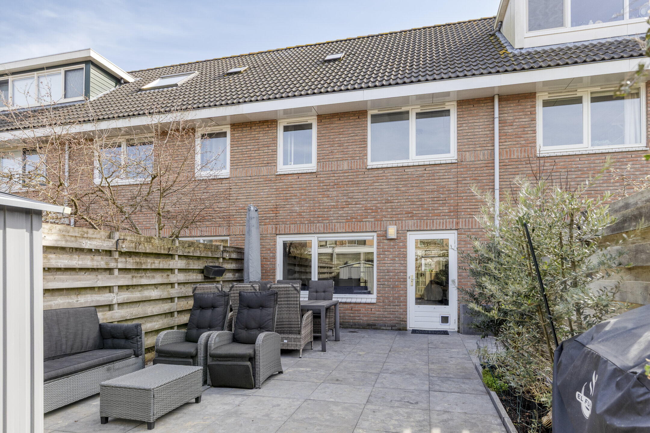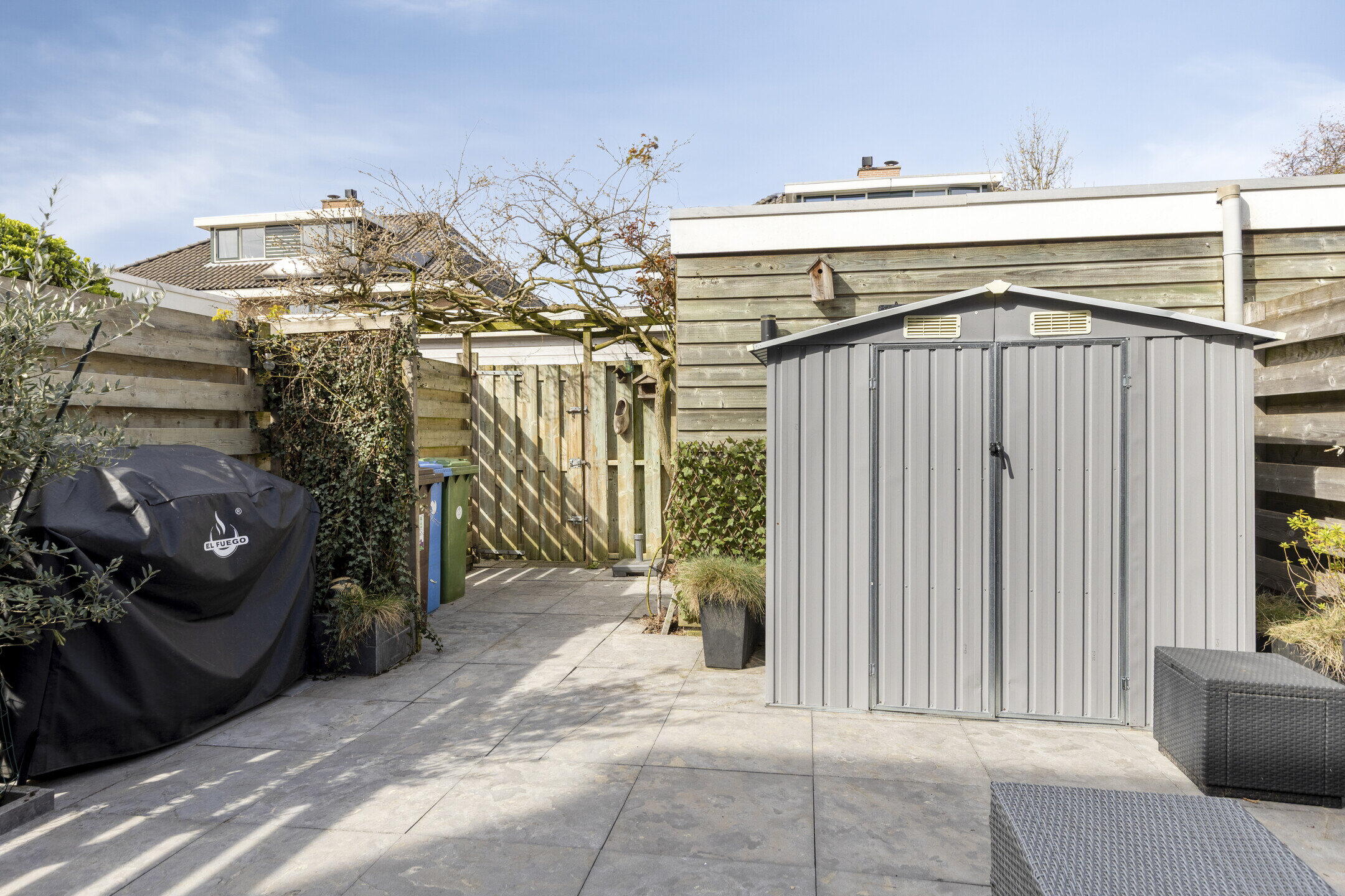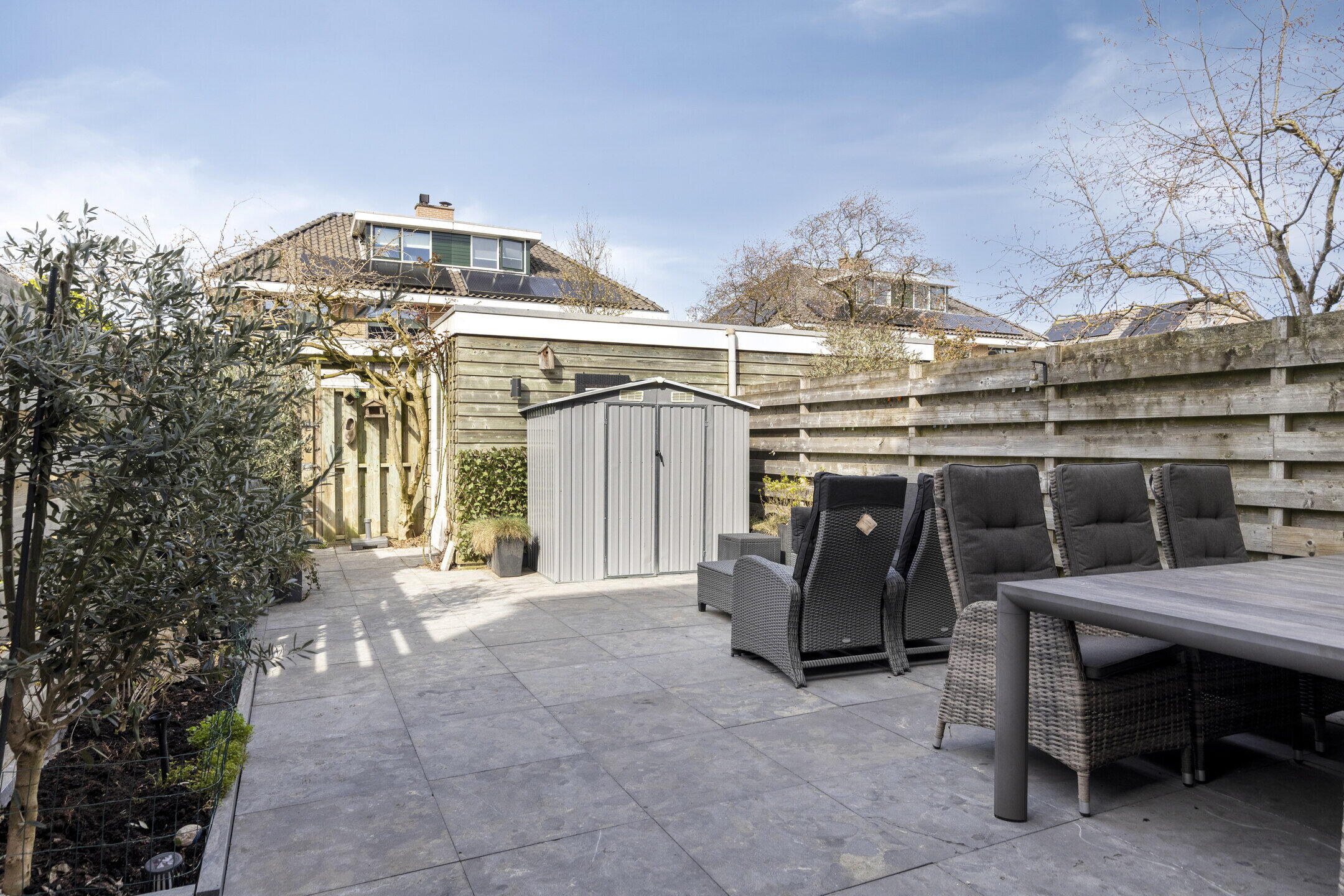 De achtertuin van deze woning is een ware oase van rust. Deze is nagenoeg volledig betegeld en biedt daardoor een onderhoudsvriendelijke buitenruimte waar u optimaal van kunt genieten. Daarnaast is er een vrijstaande hout afgetimmerde berging aanwezig, ideaal voor het opslaan van tuinmeubilair, gereedschap of fietsen. Via de achterom kunt u gemakkelijk de tuin betreden.