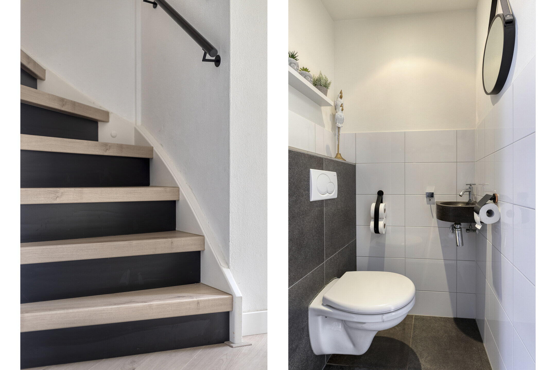 De volledig betegelde badkamer op deze verdieping is voorzien van een stort-douche, dubbele wastafel en een tweede toilet, wat het comfort en de functionaliteit van deze verdieping aanvult.